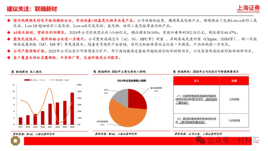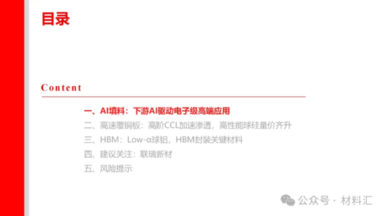 AI大模型迅猛发展,对新一代高频高速、芯片封装用的上游填料性能提出更高要求。新一代高频高速覆铜板方面,为保证更低介质损耗,超纯球形二氧化硅正成为行业主流选择;芯片封装方面,Low-α球硅及low-α球铝,HBM封装用环氧塑封料的主要填料。