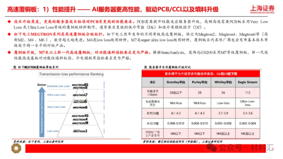 性能提升——AI服务器更高性能,驱动PCB/CCL及填料升级。更高的服务器技术标准对PCB有着更高的性能要求。高频高速需要PCB板采用Very Low Loss或Ultra Low Loss等级覆铜板材料制作,通常要求更低的低介常数(Dk)和低介质损耗因子(Df)。随着升级至M7及以上新一代高速覆铜板,对功能填料指标要求也更为严格。