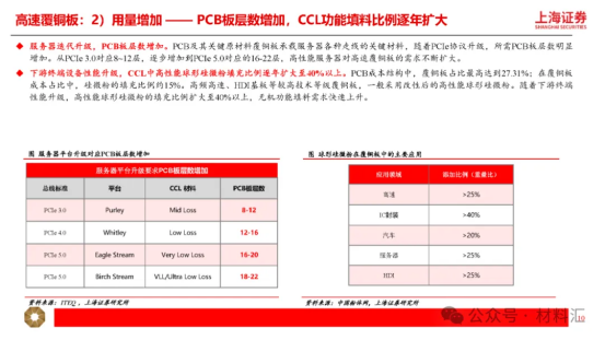 用量增加——PCB板层数增加,CCL功能填料比例逐年增大。随着PCIe协议升级,所需PCB板层数明显增加。从PCIe3.0对应8~12层,逐步增加至PCIe5.0对应16-22层,高性能服务器对高速覆铜板的需求不断扩大。下游终端设备性能升级,CCL中高性能球形硅微粉填充比例逐年扩大至40%以上,带动无机功能填料需求快速上升。
