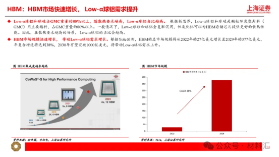 HBM市场快速增长,推动Low-α球铝需求提升。Low-α球铝和球硅占GMC重量的80%以上,随散热要求越高,Low-α球铝占比越高。根据Yole的预测,HBM的总市场规模将从2022年的27亿美元增长至2029年的377亿美元,年复合增速将达到38%,2030年有望突破1000亿美元,将带动Low-α球铝需求提升。