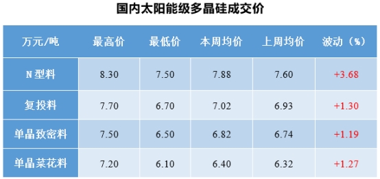 o 本周国内N型料价格区间在7.50-8.30万元/吨,成交均价为7.88万元/吨,周环比上涨3.68%;