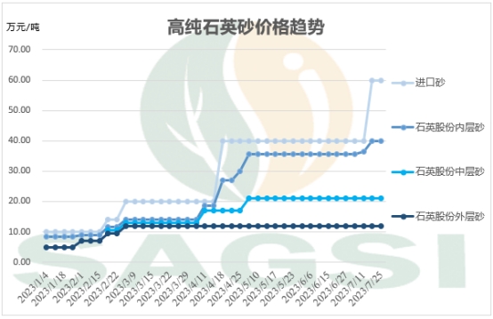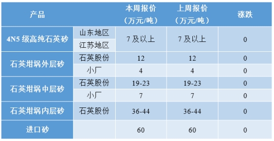 o 山东地区和江苏地区4N5级别石英坩埚用高纯石英砂的价格在7万元/吨及以上,与上周持平;