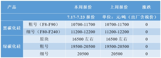 数据来源:爱锐网黑碳化硅:本周,受原材料石油焦价格小幅上涨支撑,我国黑碳化硅磨料价格持稳运行。考虑到当前正值国内迎峰度夏关键阶段,需求端支撑力度较上半年稍有改善,石油焦价格亦或保持坚挺运行,预计未来一周,我国黑碳化硅磨料价格或坚挺运行。绿碳化硅:本周,受需求端疲软等因素影响,我国绿碳化硅价格弱稳运行。